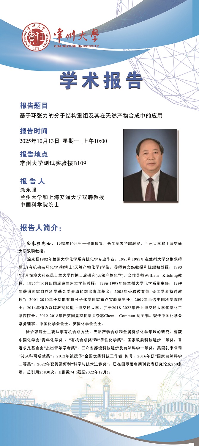 【學(xué)術(shù)報(bào)告】10月13日自然與合成有機(jī)化學(xué)研究院學(xué)術(shù)報(bào)告——涂永強(qiáng)院士 上海交通大學(xué)