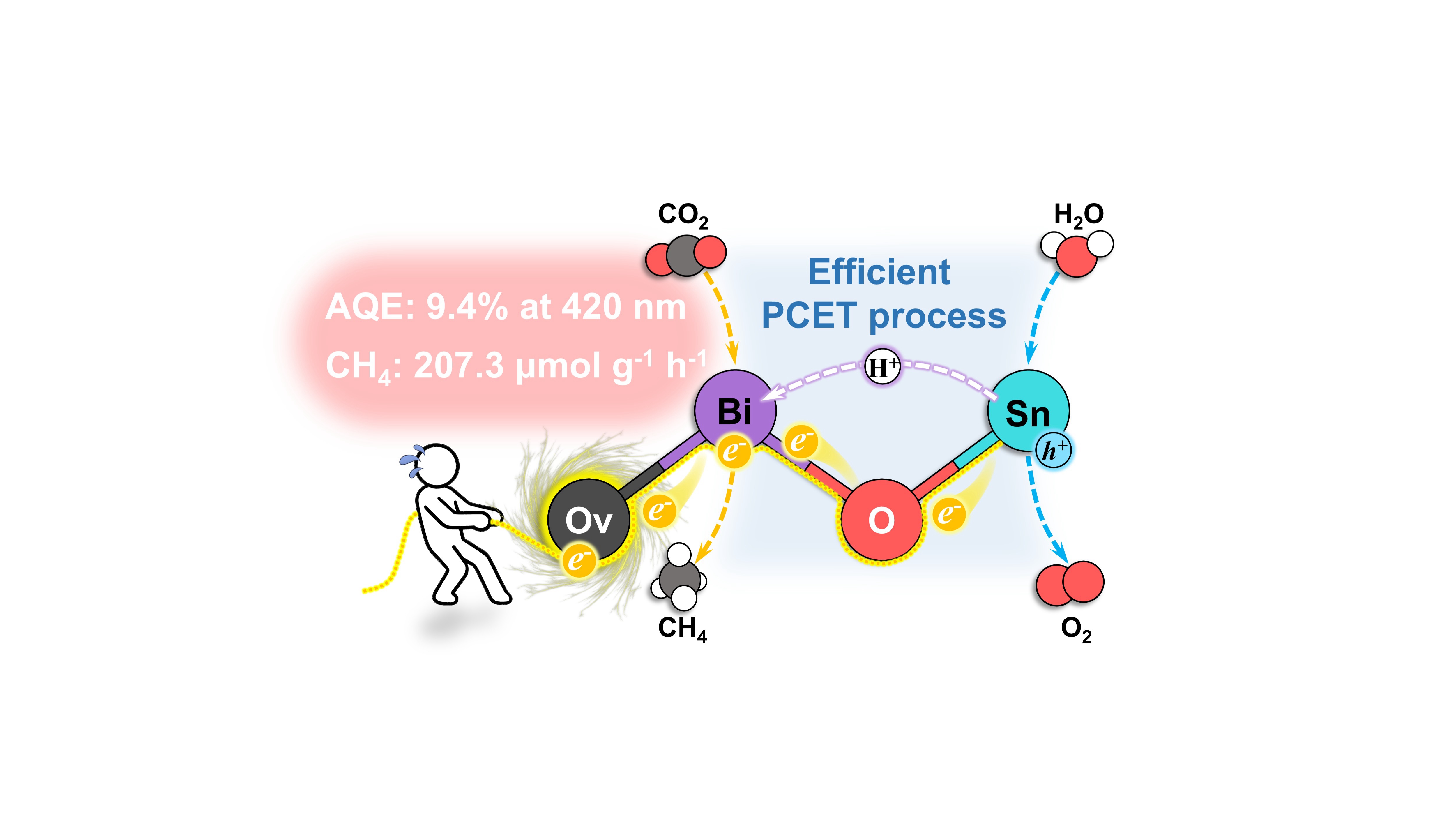 (1)通過氧空位誘導(dǎo)生成Bi-O-Sn氧化還原位點,極大增強了質(zhì)子耦合電子傳遞(PCET)過程。該研究通過調(diào)控Bi的電子結(jié)構(gòu),優(yōu)化Bi 6p與*CHO 2p 軌道雜化,顯著降低了關(guān)鍵中間體*CHO的能壘,表現(xiàn)出卓越的催化性能,CH4產(chǎn)率達207.3 μmol g-1 h-1,選擇性為95.7%。相關(guān)成果以“Oxygen Vacancy-Driven Asymmetrical Charge Distribution on Bi-O-Sn Sites in Sn-Doped Bi2MoO6 for Efficient Photocatalytic CO2-to-CH4 Conversion”為題發(fā)表在Angewandte Chemie International Edition(Angew. Chem. Int. Ed. 2025, e21874)。