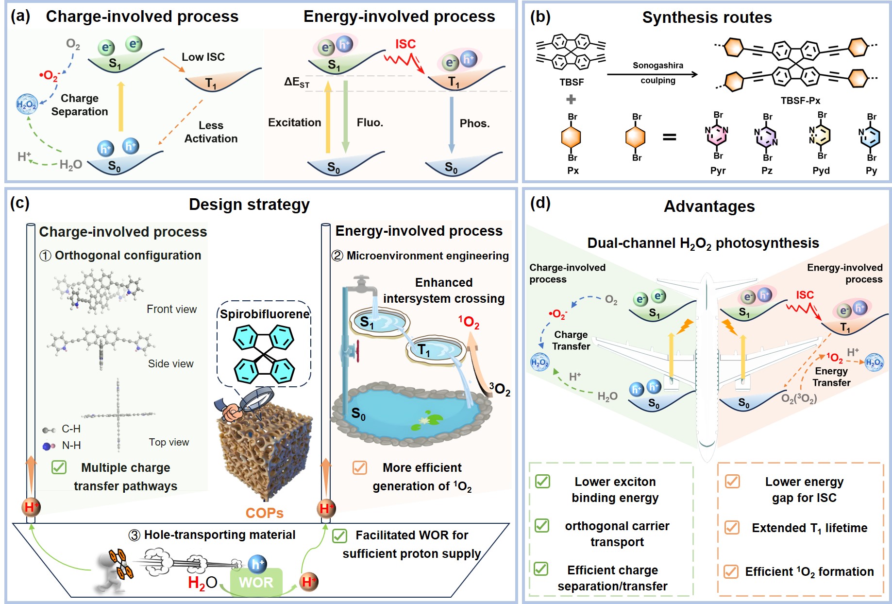 (3)針對能量路徑較弱的問題,我們探索了將傳統(tǒng)的電荷路徑與能量路徑耦合的策略。能量路徑是指以單線態(tài)氧(1O2)為關(guān)鍵中間體生產(chǎn)H2O2,1O2主要由三線態(tài)氧(3O2)產(chǎn)生,此過程涉及從三重激發(fā)態(tài)(T1)回到基態(tài)(S0)的能量轉(zhuǎn)移。目前大多數(shù)催化劑的T1壽命較短,難以穩(wěn)定存在,這是能量路徑研究較少的主要原因。為此,我們繼續(xù)以螺二芴為結(jié)構(gòu)單元,通過交聯(lián)劑的微環(huán)境調(diào)控制備一系列COPs催化劑,提高其電荷和能量雙路徑的性能(圖3)。其優(yōu)點包括:在電荷路徑,降低了激子結(jié)合能,提高電荷分離效率,通過正交通道增強電荷傳輸;在能量路徑,降低了從單重激發(fā)態(tài)(S1)到T1的能壘,加速系間竄躍,延長T1壽命,從而提高生產(chǎn)1O2的效率。優(yōu)化后的COPs催化劑在在純水和空氣中的產(chǎn)H2O2速率達(dá)到7.21 mmol g-1 h-1,太陽能-化學(xué)能轉(zhuǎn)化效率更是高達(dá)1.88%。該類催化劑在三相漂浮體系、太陽光照實驗、連續(xù)流實驗和滅菌實驗中均取得了較好的性能。該工作以Achieve a simultaneous charge- and energy-involved dual-channel mechanism in spirobifluorene-based conjugated organic polymers for enhanced H2O2 photosynthesis為題發(fā)表在化學(xué)領(lǐng)域頂級期刊J. Am. Chem. Soc.2025, DOI: 10.1021/jacs.5c16544.
