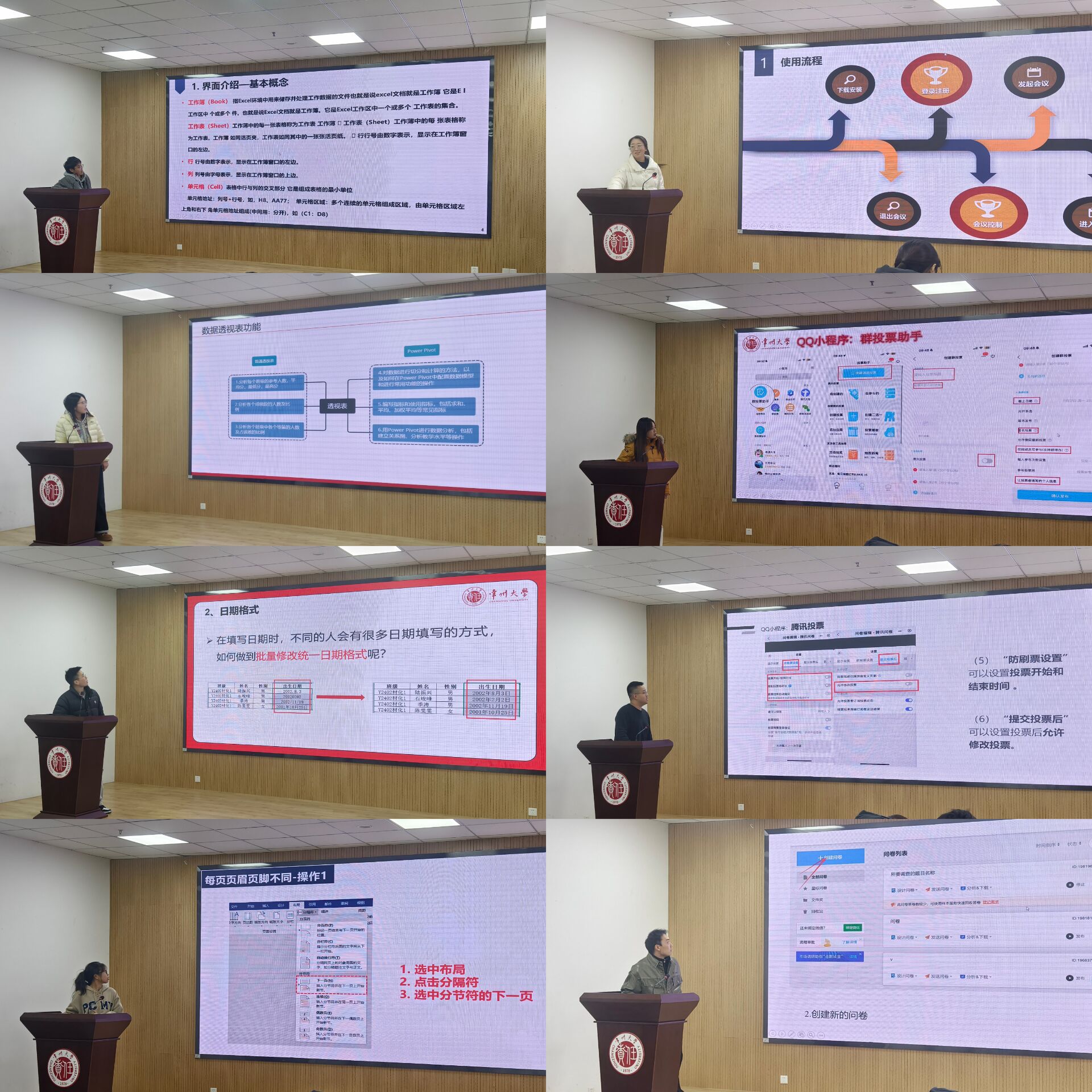 會上,各主講人主講人結合研究生工作實際,分享了Excel的基礎、進階和高級操作,帶領大家學習了文檔規(guī)范排版、格式設置、數(shù)據(jù)處理等方面的操作技巧,并根據(jù)不同的工作場景,對騰訊會議、在線表格、問卷星等信息收集工具進行現(xiàn)場演示。此外,主講人結合日常展示匯報所需,講解了PPT、PDF實用功能,并推薦了高效PDF工具。培訓過程中,宣講人傾囊相授,學生干部們聚精會神,現(xiàn)場跟學操作,并就實際工作中遇到的問題進行交流討論。
